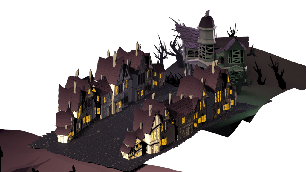 Using this as a basis, I started throwing together new bits of geometry, creating something that resembled the traditional Hauted house look that I was after. Knowing I would only see it from one angle gave me agency to create only what I wanted to see, not needing to bother about the back side. I surrounded it with craggy trees and boarded up the windows.