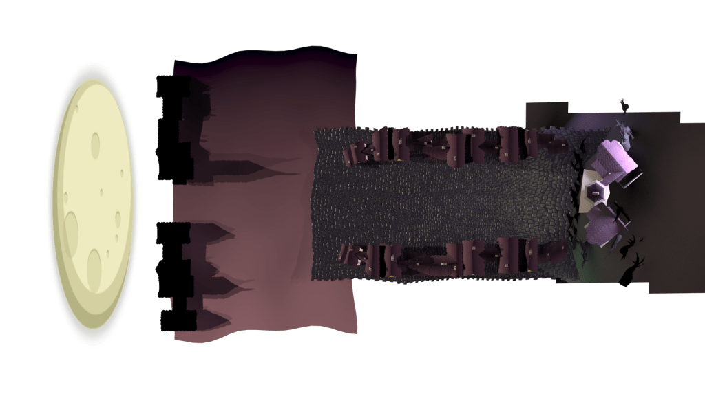 I drew a couple of circles in Photoshop and placed the very moon in the sky! I threw in a few lights (which was interesting to consider for a 360 view of the scene) which can be seen in the pictures above. But there was something else I needed to give this beaut the atmosphere I desired – A heavy downpour.